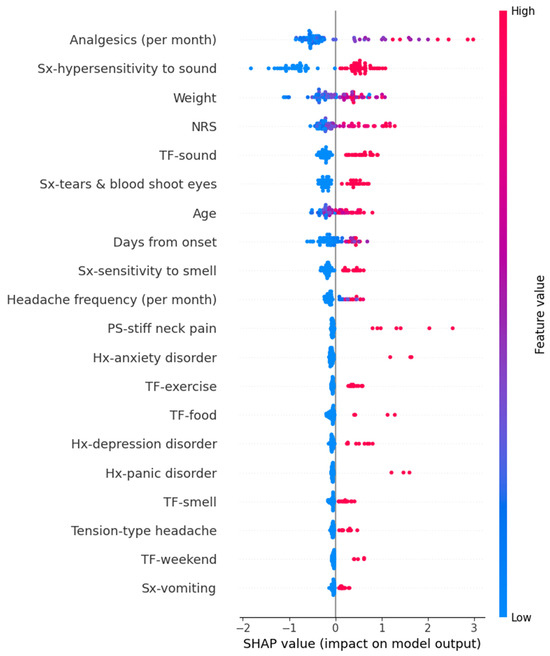 SHAP value in Random Forest model of predicting Generalized Anxiety Disorder-7. Hx, history; NRS, numeric rating scale as usual headache intensity; PS, preceding symptom; SHAP, Shapley; Sx, symptom; TF, trigger factor.