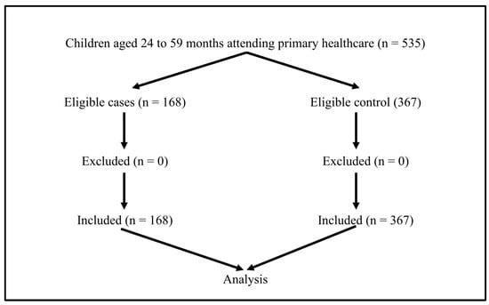 All children who attended the selected primary healthcare facilities during the study period were included in the study. A total of 168 AOM-positive and 367-AOM negative children were enrolled. Figure 1 shows how participants were selected. All variables were fully curated from all participants.