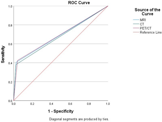 Figure 1 presents the sROC curves, demonstrating the performance of CT, MRI, and PET/CT when including tumors smaller than 0.5 cm. While not statistically significant, PET/CT demonstrated a slightly higher specificity and AUC (0.691) compared to MRI (0.689) and CT (0.678). For lesions smaller than 0.5 cm, pairwise comparisons of the ROC curves using the DeLong test showed no statistically significant differences between the AUC values of PET/CT (0.691), MRI (0.689), and CT (0.678) (CT vs. MRI: p = 0.4206; CT vs. PET/CT: p = 0.4570; MRI vs. PET/CT: p = 0.9023). Given that the AUC values for all three imaging modalities ranged between 0.60 and 0.70, it was concluded that they exhibited poor sensitivity in detecting tumors smaller than 0.5 cm, as shown in Table 3.