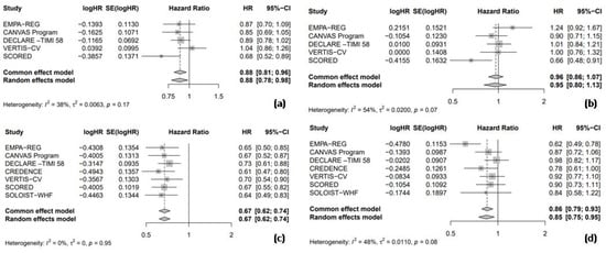 Data from five trials were included to assess the HR for nonfatal MI and nonfatal stroke, comparing the efficacy of SGLT2 inhibitors to the placebo in T2DM patients. In the pooled analysis of the five trials, SGLT2 inhibitors significantly led to a 12% reduction in nonfatal MI compared to the placebo (HR = 0.88, 95% CI: 0.78–0.98, I2 = 38%, Figure 2a). However, no significant difference was observed between the SGLT2 inhibitors and placebo groups regarding the risk of nonfatal stroke (HR = 0.95, 95% CI: 0.80–1.13, I2 = 54%, Figure 2b). All seven included RCTs reported the HR for HHF and cardiac death. In the pooled analysis of these seven trials, SGLT2 inhibitors significantly reduced the risk of HHF by 33% compared to the placebo (HR = 0.67, 95% CI: 0.62–0.74, I2 = 0%, Figure 2c) and cardiac death by 15% compared to the placebo (HR = 0.85, 95% CI: 0.75–0.95, I2 = 48%, Figure 2d).