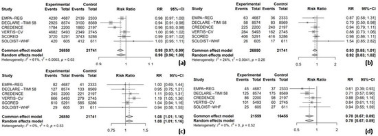 Whereas the previous research focused solely on patients with T2DM, the present study expanded the scope to include patients with HF and CKD. A study that was performed by Pandey, A.K. et al. [44] in 2022 conducted a meta-analysis to investigate the cardiovascular outcomes of using SGLT2 inhibitors in patients with HF. The study demonstrated that SGLT2 inhibitors significantly reduced the RR of HHF and cardiovascular death, consistent with the results of our study. This study incorporated an additional large RCT published in 2022, including 6263 more participants. The inclusion of this new data did not alter the effect of SGLT2 inhibitors in reducing the risk ratio of cardiovascular death, but it did narrow the confidence interval by 0.1% on either side.