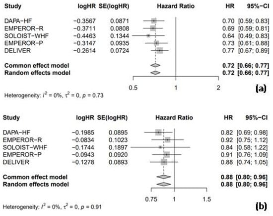 All five RCTs provided HR data for HHF, enabling a combined analysis to evaluate the efficacy of SGLT2 inhibitors compared to the placebo. The pooled analysis showed that SGLT2 inhibitors were associated with a significant 28% reduction in the risk of HHF compared to the placebo (HR = 0.72, 95% CI: 0.66–0.77, I2 = 0%; Figure 4a). Furthermore, SGLT2 inhibitors significantly reduced the risk of cardiac death by 12% compared to the placebo (HR = 0.88, 95% CI: 0.80–0.96, I2 = 0%; Figure 4b).