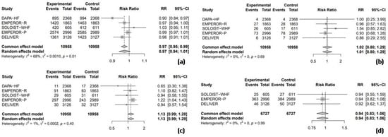 All five randomized RCTs reported RR data for adverse events, facilitating a combined analysis to compare the safety profile of SGLT2 inhibitors with the placebo. The pooled analysis revealed no significant difference in the overall adverse event rates between SGLT2 inhibitors and the placebo (RR = 0.97, 95% CI: 0.94–1.01, I2 = 68%; Figure 5a). Similarly, the use of SGLT2 inhibitors was not associated with a significant increase in the risk of hypoglycemic events (RR = 1.01, 95% CI: 0.80–1.29, I2 = 0%; Figure 5b), UTI (RR = 1.13, 95% CI: 0.99–1.29, I2 = 1%; Figure 5c), or AKI (RR = 0.94, 95% CI: 0.83–1.06, I2 = 0%; Figure 5d).
