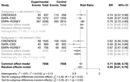 A subgroup analysis based on the estimated glomerular filtration rate (eGFR) in CKD patients, using a threshold of 45 mL/min/1.73 m2, revealed a significant difference in the risk of adverse events (Figure 8). SGLT2 inhibitors were more effective in reducing the risk of adverse events in patients with an eGFR greater than 45 mL/min/1.73 m2 compared to those with an eGFR less than 45 mL/min/1.73 m2.