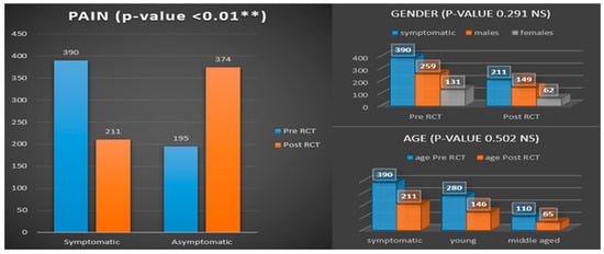 Illustration of pain before and after RCT. Symptomatic, presence of pain; asymptomatic, absence of pain; NS, nonsignificant difference with p-value ≤ 0.05; RCT, root canal treatment. ** p < 0.01.