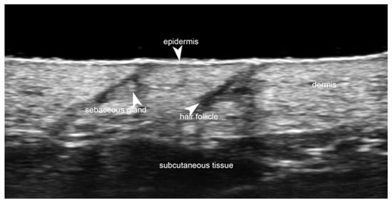 Normal non-glabrous skin at 70 MHz with a superficial bright hyperechoic monolaminar layer, which is the epidermis, a thicker but less hyperechoic band that corresponds to the dermis, and a deeper hypoechoic structure that represents the subcutaneous tissue. Notice the hyperechoic oval-shaped structure of the sebaceous gland and a hypoechoic oblique band that corresponds to the hair follicle.