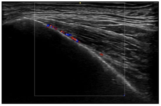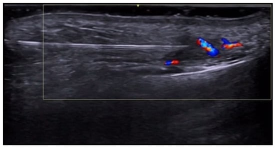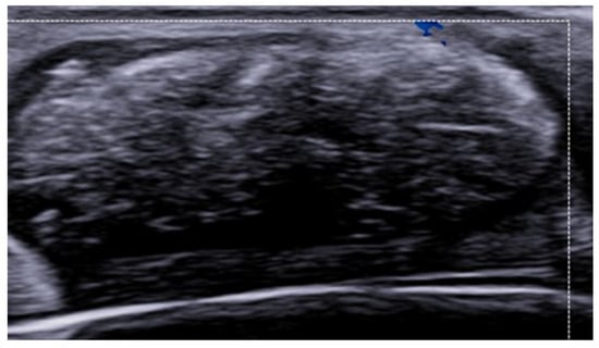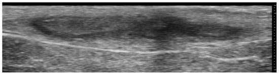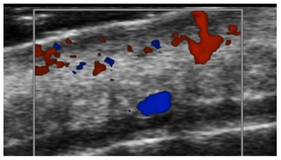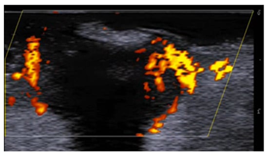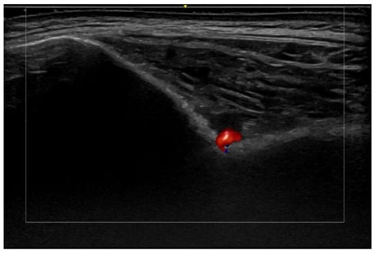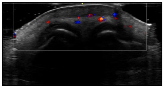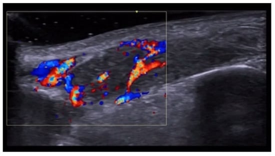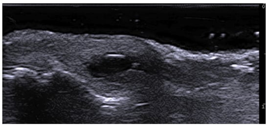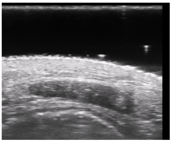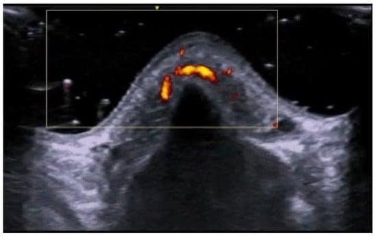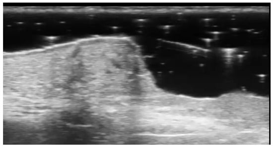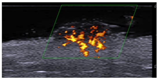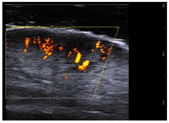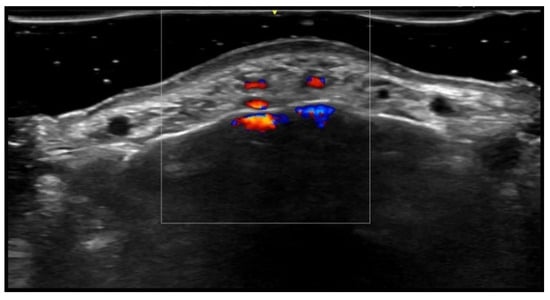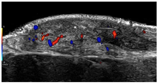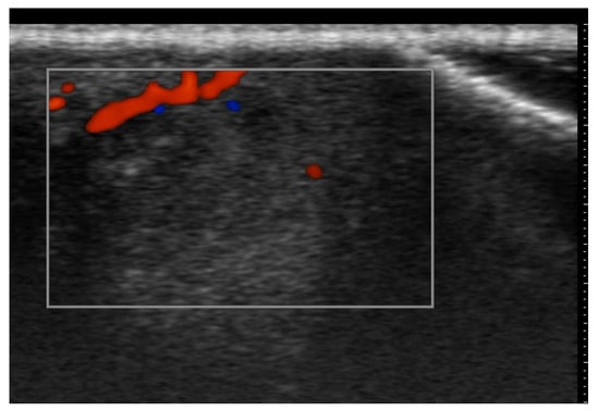 HFUS is reported to be very useful in the diagnosis, evaluation of deep hypodermal involvement, intralesional ultrasound-guided drug infiltration, and follow-up of cutaneous leishmaniasis; moreover, ultrasound can help differentiate two disease patterns, inflammatory and pauci-inflammatory ones, with shorter healing time for lesions with a pauci-inflammatory pattern (Figure 5); in fact, inflammatory patterns showed central vascularity, ill-defined margins, and more signs of panniculitis than pauci-inflammatory ones [11,12] (Figure 6).