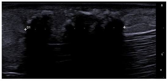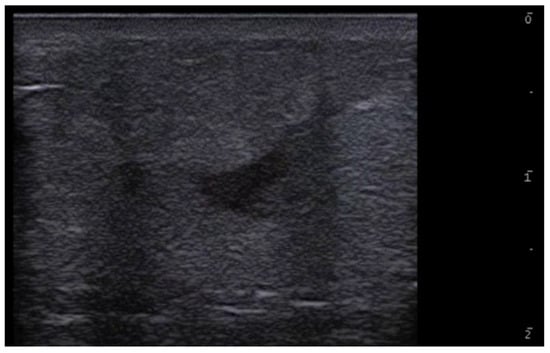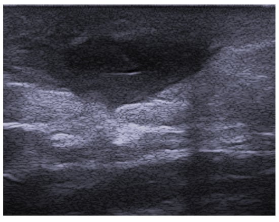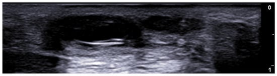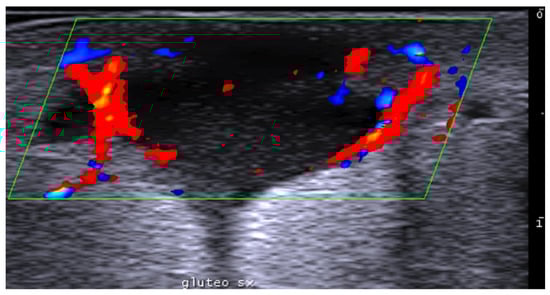 Ultrasound is useful in an emergency department setting to differentiate between abscesses and other skin and soft tissue infections such as cellulitis; this is very important, as abscesses can be managed using drainage, whereas cellulitis can be treated with antibiotics [4]. This differentiation can also be reached in the pediatric population, in which a rapid, non-invasive, painless, easily repeatable ultrasound examination can allow for a change in the management of an equivocal physical examination [5]. Abscesses are irregular, hypoechoic, or anechoic lesions with variable echogenic debris, surrounded by a hyperechoic rim and peripheral hypervascularity; cellulitis can show diffuse dermis and subcutis thickening with a hyperechoic “cobblestone” appearance and increased vascularity (Figure 2, Figure 3 and Figure 4) [6].