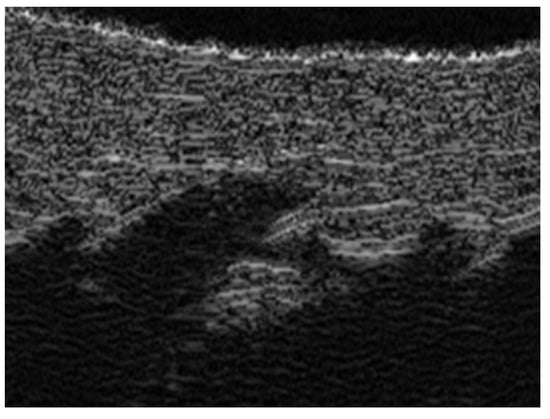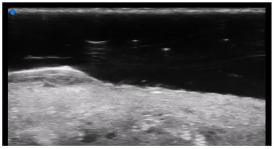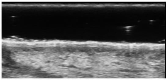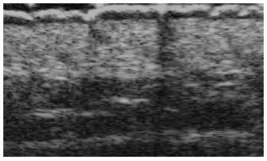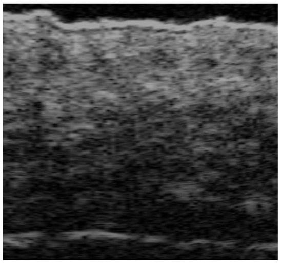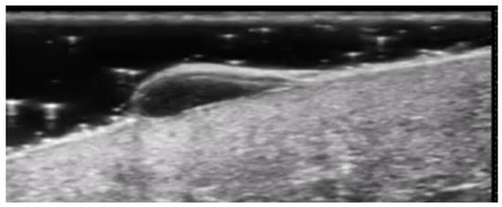 UHFUS can accurately assess epidermal, dermal, and subcutis thickness and precisely identify the epidermal–dermal junction and the boundary between the dermis and subcutaneous tissue. Therefore, it could be useful to differentiate blister locations, such as subepidermal and intraepidermal bullae, respectively, in bullous pemphigoid and pemphigus vulgaris [32] (Figure 10 and Figure 11). Moreover, intraoral UHFUS can help differentiate between oral pemphigus vulgaris and mucous membrane pemphigoid, as statistically significant differences between the echogenicity of these two lesions were identified [33].