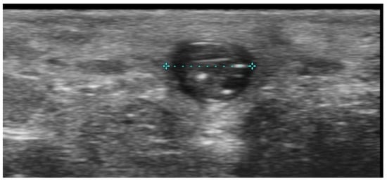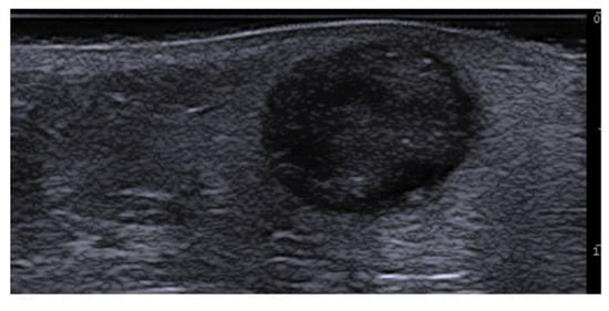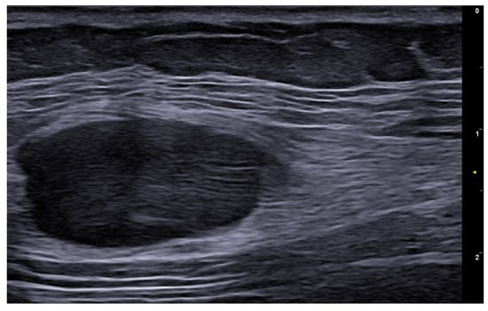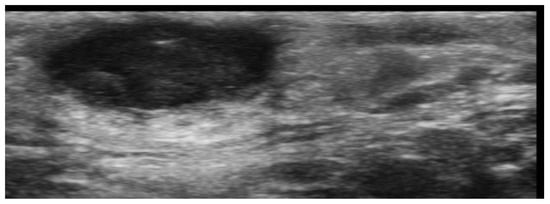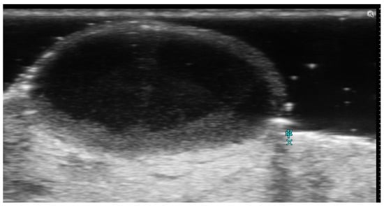 Ultrasound can image trichilemmal cysts as dermal and/or subcutaneous oval-shaped heterogeneous hypoechoic lesions with inner echogenic material without a tract toward the epidermis, occasionally with a few fragments of hair tracts and calcifications (Figure 15) [71].