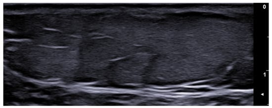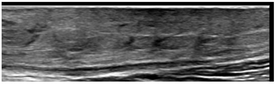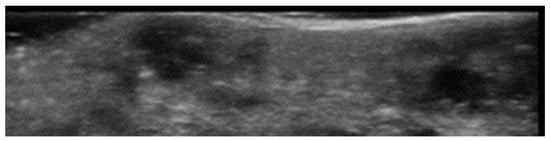 Pseudoxanthoma elasticum skin lesions are oval homogeneous hypoechogenic areas in the mid- and deep dermis related to the presence of glycosaminoglycans and a high level of hydration of connective tissue; moreover, undulating skin surfaces with normal epidermis and dermal/epidermal interface are reported, without a significant skin echogenic structure due to the small size of the dermal elastic fiber calcifications [65] (Figure 14).