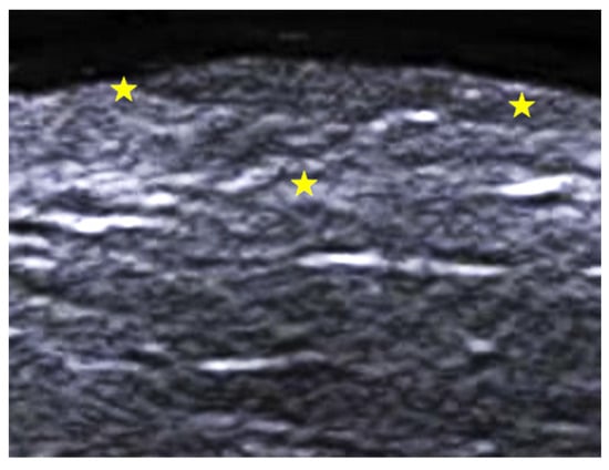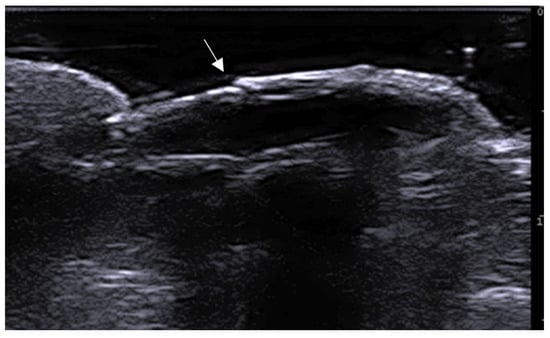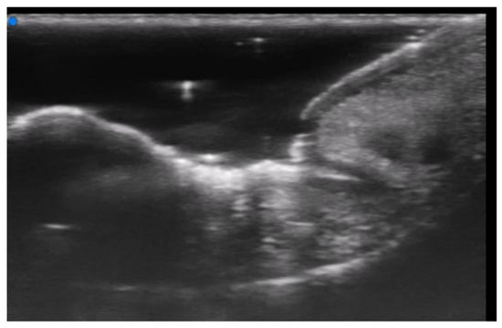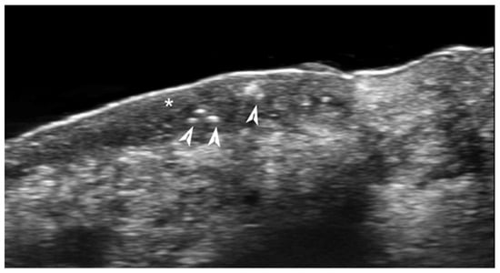 Ultrasound can allow us to diagnose or confirm the presence of clinically suspected calcinosis cutis (Figure 13), to guide intralesional drug injection such as sodium thiosulfate, and to evaluate treatment response [58,59].