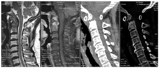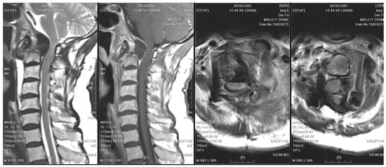 Cervical osteomyelitis, an acute or chronic infection of cervical vertebrae and intervertebral, constitutes 3–11% of all cases of spinal osteomyelitis [1,2,3]. In addition to pyogenic osteomyelitis [4], tuberculous osteomyelitis caused by Mycobacterium tuberculosis (MTB) is also reported [5]. The prevalence of spinal tuberculosis (TB) is about 1–2% of all TB, while the cervical spine accounts for 3 to 5% of all spinal tuberculosis cases [6,7,8]. The initial presenting manifestations of cervical spine tuberculous spondylitis include fever, night sweats, weight loss, neck pain, and stiffness [9]. Because cervical spondylitis deteriorates more quickly compared to other locations of spinal spondylitis [1], early diagnosis and treatment are critical.