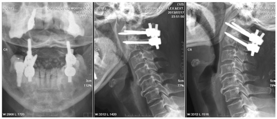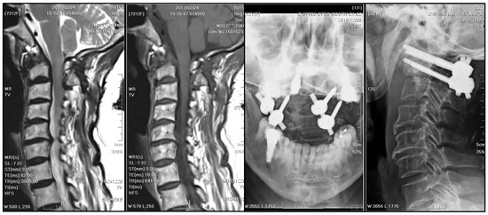 - Wang, B.; Shang, R.; Yang, T.; Zhang, H.; Hu, H.; Hu, W.; Hao, D. Evaluation of clinical outcomes of one-stage anterior and posterior surgical treatment for atlantoaxial tuberculosis complicated with neurological damage. BMC Musculoskelet. Disord. 2019, 20, 148. [Google Scholar] [CrossRef]