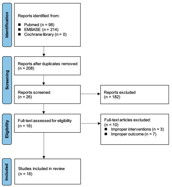 The initial database search verified a total of 312 articles. Of these, 296 articles were excluded: 88 were duplicate publications, and 182 were excluded after abstract review. A total of 26 articles were selected for full-text evaluation. Further review excluded 10 articles as they were irrelevant to the analysis: 3 for cited improper interventions and 7 for improper outcomes. Finally, 16 RCTs, including 1865 patients, were identified as relevant for the current study and selected for the meta-analysis [10,16,17,18,19,20,21,22,23,24,25,26,27,28,29,30]. Figure 1 shows the study flow chart.