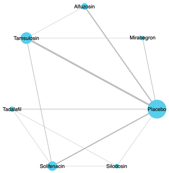 Five studies compared alfuzosin and a placebo [24,25,26,28,30]. Eight trials compared tamsulosin and a placebo [16,20,21,22,23,24,27,29]. One study compared silodosin and a placebo [18]. Five studies compared solifenacin and a placebo [18,19,20,21,22]. Two articles compared mirabegron and a placebo [16,17]. Two studies compared tadalafil and a placebo [10,18] (Figure 2).