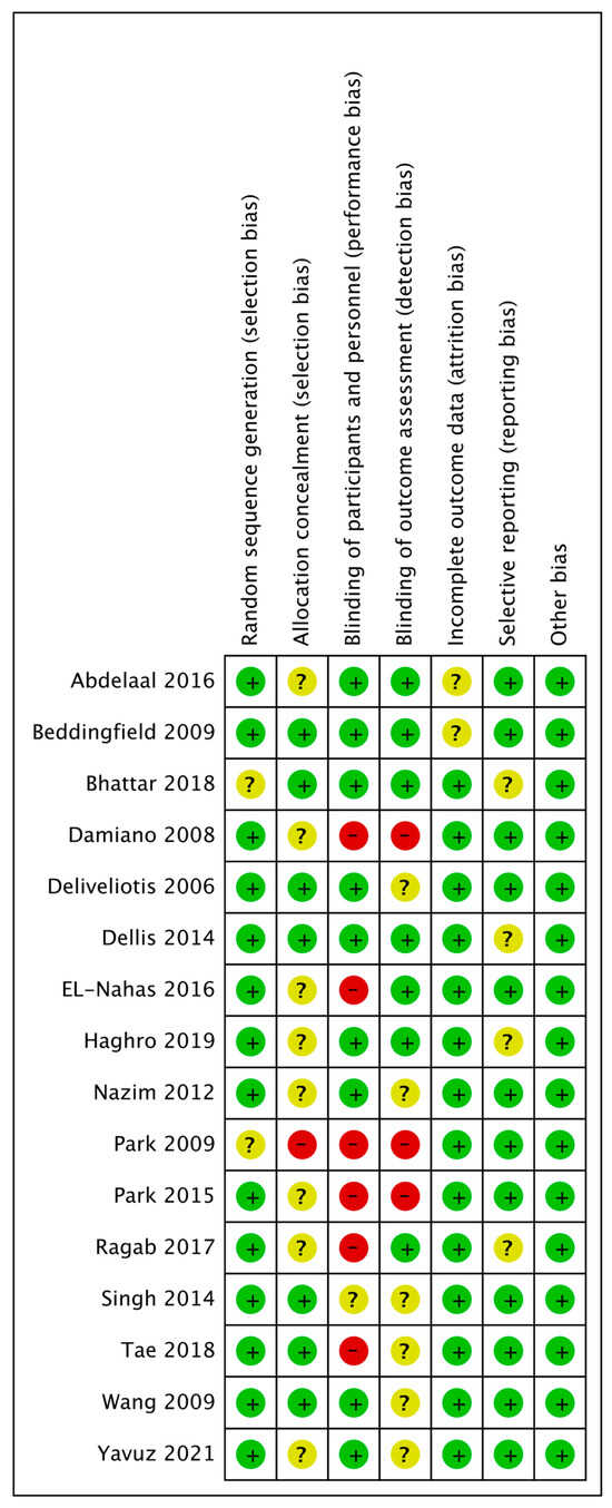 Risk of bias for eight RCTs. +, no bias; –, bias; ?, bias unknown. RCT: randomized controlled trial [10,16,17,18,19,20,21,22,23,24,25,26,27,28,29,30].
