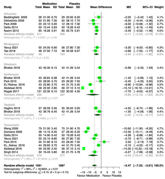 A pairwise meta-analysis of the USS between each medication and the placebo is shown in Figure 6. The pooled data that compared the USS between alfuzosin and the placebo showed a significantly lower alfuzosin USS (MD: −4.11: 95% CI: −5.42 to −2.79, p < 0.001). The mirabegron USS was lower than that of the placebo (MD: −3.94, 95% CI: −5.91 to −1.96, p < 0.001). The solifenacin USS was lower than that of the placebo (MD: −6.86, 95% CI: −12.10 to −1.62, p < 0.001). The tadalafil USS was lower than that of the placebo (MD: −2.96, 95% CI: −5.76 to −0.17, p < 0.001). And last, the tamsulosin USS was lower than that of the placebo (MD: −6.69; 95% CI: −10.47 to −2.92, p < 0.001).