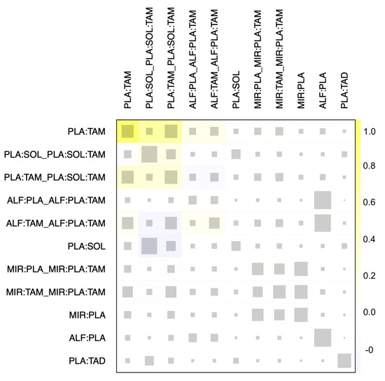 Net heat plot for inconsistency. Net heat plot shows little inconsistency within the whole network. PLA, placebo; ALF, alfuzosin; MIR, mirabegron; SOL, solifenacin; TAD, tadalafil; TAM, tamsulosin.