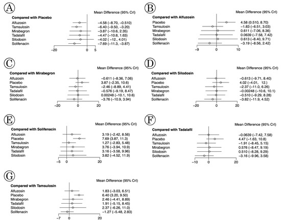 Network meta-analysis of each medication for USS; Compared with (A) placebo, (B) alfuzosin, (C) mirabegron, (D) silodosin, (E) solifenacin, (F) tadalafil, and (G) tamsulosin. Compared with the placebo, mirabegron (MD: −3.87, 95% CI: −10.6 to 2.35), tadalafil (MD: −4.47, 95% CI: −10.8 to 1.63), and silodosin (MD: −4.02, 95% CI: −12 to 4.01) did not show significant differences, whereas others did. All medications had insignificant differences, except for the placebo, compared with solifenacin. Alfuzosin, mirabegron, silodosin, solifenacin, and tadalafil were not inferior to tamsulosin in the USS using Bayesian analyses. MD, mean difference; USS, urinary symptom score; CI, confidence interval.