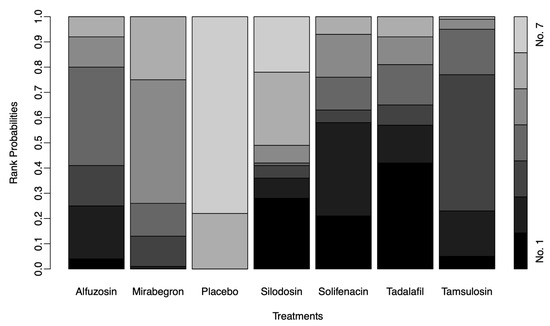 In the network meta-analyses, the USS of mirabegron (MD: −3.87, 95% CI: −10.6 to 2.35), tadalafil (MD: −4.47, 95% CI: −10.8 to 1.63), and silodosin (MD: −4.02, 95% CI: −12 to 4.01) did not exhibit significant differences to the placebo, whereas others did (Figure 8). Compared with solifenacin, all medications possessed insignificant differences, except for the placebo (MD: 7.69, 95% CI: 3.87 to 11.3). When comparing tamsulosin, alfuzosin, mirabegron, and silodosin using Bayesian analyses of the USS, solifenacin and tadalafil were not inferior to tamsulosin. In the random effect model, P-score tests using frequentist inference to rank treatments in the network showed that solifenacin possessed the highest P-score (p = 0.8484); tamsulosin was the second highest (p = 0.7054). As a result of the rank-probability test, solifenacin was also ranked highest in USS, and tamsulosin was ranked second (Figure 9).
