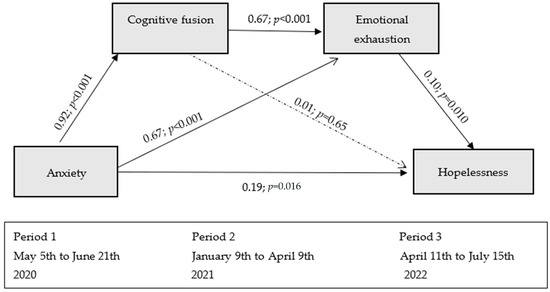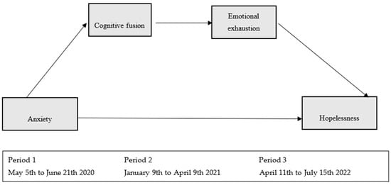 Although previous literature points to the relevance of studying hopelessness as a key mood state associated with quality of life [12] or suicidal ideation [10], few studies have assessed this variable in healthcare personnel during the COVID-19 pandemic. In this context, to contribute to the explanation of hopelessness (11 April to 15 July 2022), the model proposed in the present study in Spanish nurses starts from the anxiety experienced at the beginning of the pandemic (5 May to 21 June 2020), including cognitive fusion and emotional exhaustion evaluated six months later (9 January to 9 April 2021) as possible contributing factors to the development or chronification of hopelessness.
