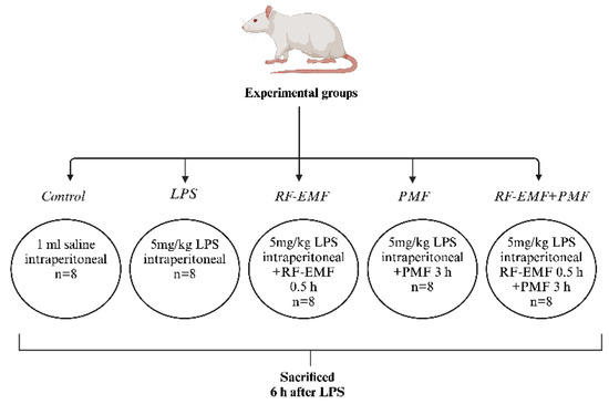 - RF-EMF + PMF: To create an acute sepsis model, rats that received a single dose of 5 mg/kg i.p. LPS were subjected to a combination of simultaneously activated RF-EMF (for 0.5 h) and PMF (for 3 h) applications. The rats were left in the inactivated unit until the 6th hour.