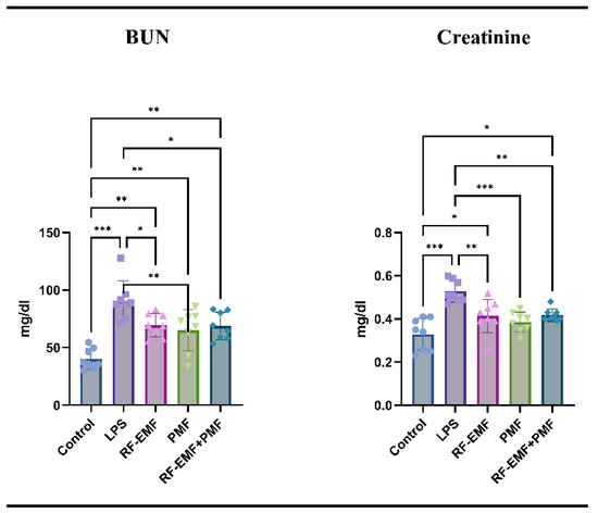 Serum levels of BUN and creatinine. LPS: Lipopolysaccharide, RF-EMF: Radiofrequency Electromagnetic Field, PMF: Pulsed Magnetic Field. The values are presented as the means ± SDs. The relationships between groups and the results of the biochemical marker analysis were assessed via one-way ANOVA. * p < 0.05, ** p < 0.01, *** p < 0.001.