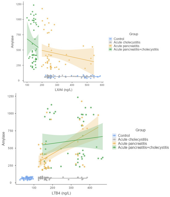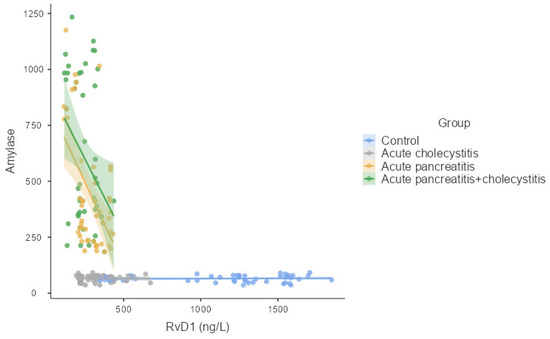 Correlation of RvD1, LTA4, and LXB4 with amylase.