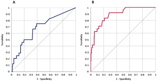 Graph of the ROC curve analysis for PCT values in PLWH admitted to the ED associated with mortality (A) and BSI (B).