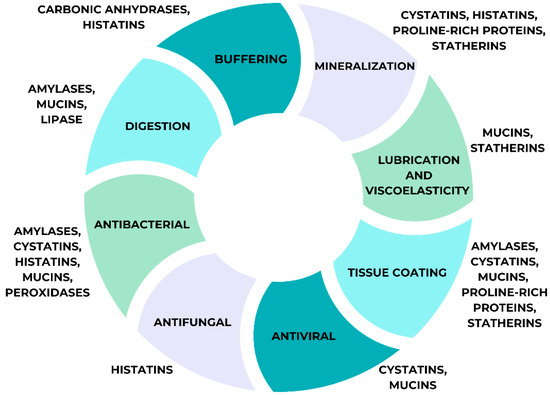 Saliva is 99% water and is an exocrine solution. Proteins make up 0.3% of the total, inorganic substances account for 0.2%, and organic molecules make up the remaining. Enzymes such as amylases, peroxidase, lipase, lysozyme, lactoferrins, kallikreins, cystatins, hormones, and growth factors are examples of organic components, whereas sodium, potassium, calcium, magnesium, chloride, and carbonates are examples of inorganic components [9]. Of the approximately 3000 protein components found in saliva, over 90% belong to the following classes: α-amylases, proline-rich proteins (PRPs; classified as acidic, basic, or basic glycosylated), mucins, salivary cystatins (also known as “S-type”), histatins, statherin, and P-B peptide. Roughly 200 proteins and peptides are composed of all these components and their derivatives [10].
