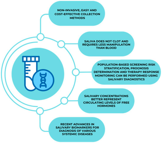 Salivary component alterations are a common symptom of systemic illnesses including cardiovascular problems, endocrine abnormalities, viral infections, malignancies, and neurological issues [4,5,6]. Because of these features, saliva can be used to monitor diseases and diagnose diseases early [7,8].