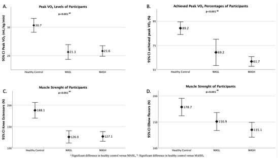 The VO2 levels were significantly lower in the MASL and MASH groups compared to the healthy control group, with the MASH group exhibiting the lowest levels among the groups (p < 0.001; Figure 1A). Figure 1B shows that the MASH and MASL groups achieved significantly lower percentages of the predicted peak VO2 compared to the healthy control group, with the MASH group achieving 62%, the MASL group achieving 69%, and the healthy individuals achieving 89% (p < 0.001). The knee extensor and elbow flexor strengths were significantly lower in the MASL and MASH groups compared to the healthy control group. However, there were no significant differences in these muscle groups between the MASL and MASH groups (p < 0.001 and p = 0.001, respectively; Figure 1C,D). While no significant differences were observed between the groups in terms of test termination (p = 0.192), participants in the MASH and MASL groups were more likely to stop due to fatigue and difficulty maintaining the required test pace compared to the healthy control group.