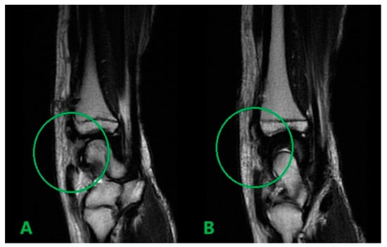 Preoperative sagittal T2 MRI scans showing the distal ends of the injured ECRL (A) and ECRB (B) tendons.