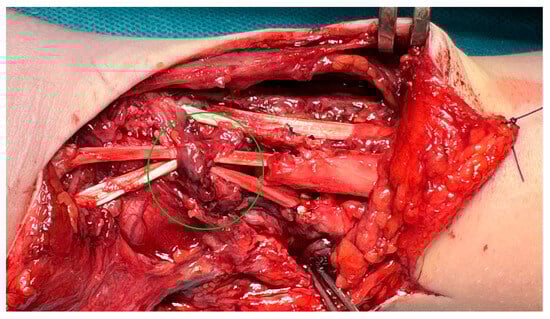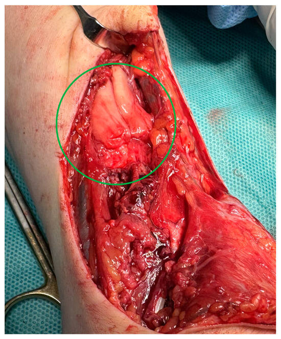 MRI scans showing the distal ends of the injured ECRL and ECRB tendons are shown in Figure 1. The extensor pollicis longus (EPL) tendon was preserved. After preparation, the patient underwent surgery. The procedure was performed under a tourniquet. The post-traumatic wound was widened proximally and distally to visualize and release scar tissue properly. After mobilization and resection of the tissue scar, the distal ends of the damaged radial extensors were visualized (Figure 2). The extent of the damage matched the MRI results. The proximal ends of the ECRL and ECRB formed a common scar and underwent retraction that did not allow mobilization (Figure 3).