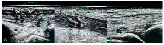 Longitudinal ultrasound sections of the reconstructed tendons six weeks after surgery confirming the efficacy of the distal Pulvertaft sutures. APL (A), ECRL (B), and ECRB (C). The most suitable ultrasound graft integration for ECRB tendon.