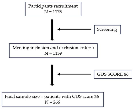 The presence of depressive symptoms was assessed using the standardized Geriatric Depression Scale (GDS) Short Form questionnaire, which was developed by Yesavage et al. [34]. The GDS has shown a 92% sensitivity and a specificity of 89% in detecting depressive symptoms, with excellent reliability (α = 0.91) [35,36]. The GDS short form consists of standardized 15 questions. Authors Sheikh and Yesavage validated both the long and short formats of the GDS (30 and 15 questions, respectively) in 1986. In a validation study, both iterations were found to be very effective in discriminating between individuals with and without depression, while showing a strong correlation [36]. The conclusion was that the short version of the GDS is suitable for screening for the presence of depressive symptoms. The American Psychological Association advocates using the GDS short questionnaire because it can be completed in approximately 5 to 7 min. This makes it particularly suitable for people who tire easily or cannot concentrate for long periods [37]. A GDS short-form questionnaire score of more than 5 requires further psychological assessment, as it indicates depressive states.
