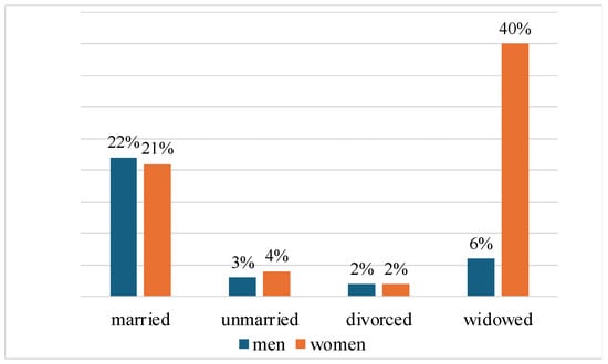 In addition, depressive symptoms (GDS ≥ 6) occur in around a third, or 29%, of participants from care homes, while only 22% of people living in private households have similar symptoms. This illustrates the differences in mental health outcomes depending on living conditions. Further analysis clearly shows that there are no significant differences in the prevalence of depressive symptoms between the groups when the categories of respondents’ marital status are considered (χ2 = 160.29, p < 0.01), as shown in Table 2. However, when comparing men and women with GDS ≥ 6 according to their marital status (Figure 3), it becomes abundantly clear that the female cohort with depressive symptoms contains a significantly larger proportion of widows (40%), while the male cohort is predominantly characterized by married people (22%).