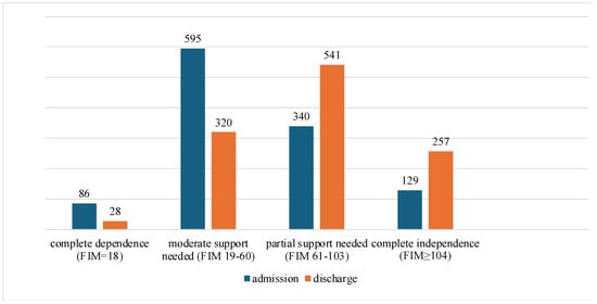 The study found no statistically significant correlation between FIM scores recorded at the time of patient admission and scores derived from the GDS. However, it is important to emphasize that a modest, but statistically significant correlation was found between these two important measures at the time of patient discharge, as indicated by the values of p = 0.043 and r = −0.06. This inverse correlation indicates that an improvement in functional status is associated with a decrease in GDS scores, which logically implies a corresponding decrease in the severity of depressive symptoms. Furthermore, the results from the non-parametric Wilcoxon matched-pairs test provide compelling evidence of significant changes in FIM scores when comparing admission scores to those at discharge across all FIM categories: complete dependence (p = 0.0003, d = 0.72), moderate support needed (p = 0.0001, d = 0.56), partial support needed (p = 0.0001, d = 0.56), complete independence (p = 0.0008, d = 0.60). Notably, there is a marked decrease in the number of patients classified as completely dependent and moderately dependent by the end of rehabilitation (see Figure 4). At the same time, there is a significant increase in patients classified as partially independent and fully independent, showing a clear and positive trend in these two categories in terms of improvement in functional status at discharge. However, the effect sizes calculated for each category indicate a moderate impact on the overall interpretation of these findings.