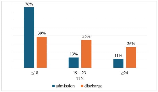 The relationship between depressive symptoms and the Tinetti score was then examined in detail, as 76% of all participants were classified as at risk of falling. First, a statistically significant difference was found when Tinetti scores at the time of admission were compared with those at the time of discharge (χ2 = 5.04, p < 0.001). In addition, as can be seen in Figure 5, the proportion of patients who were categorized as having a “high fall risk” (TIN ≤ 18) decreased by a remarkable 37% after rehabilitation (76% to 39%).