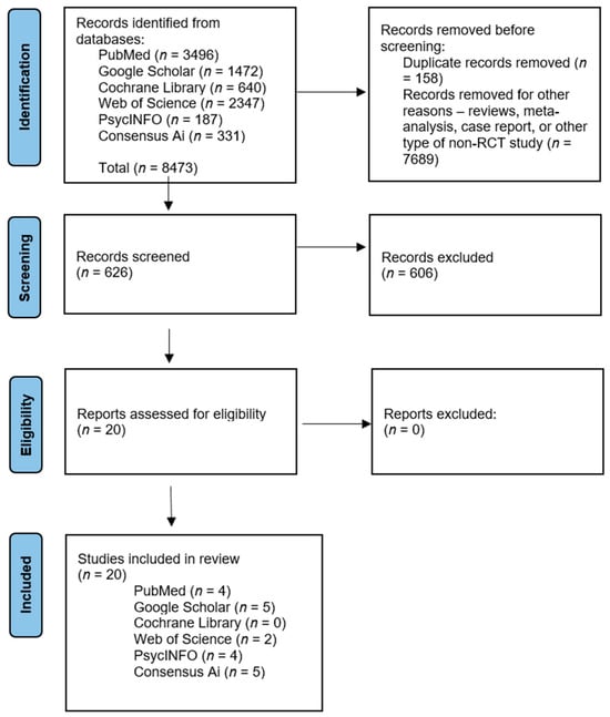 A total of 8473 papers were identified through database searches using PubMed, Google Scholar, the Cochrane Library, Web of Science, PsycINFO, and the AI tool Consensus. The authors eliminated 158 duplicated articles, and 7689 were excluded because they were not aligned with the inclusion criteria (reviews, a meta-analysis, a case report, or another type of non-RCT study). Six hundred and twenty-six papers were selected for the second screening by studying the abstracts. We removed articles that treated subjects with other pathologies, medication, or chemotherapeutic approaches compared with psychotherapy. Twenty key articles on randomized controlled trials examining the impact of psychotherapy on cancer patients were selected (Figure 1). The PRISMA framework guided the selection process, ensuring the systematic and rigorous identification of the most relevant and high-quality studies for analysis.