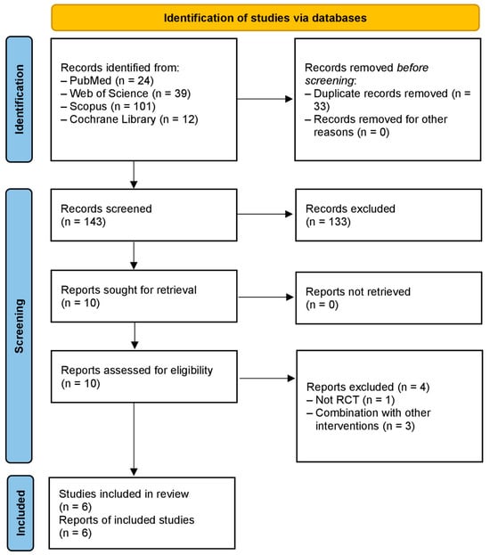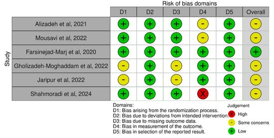 After conducting a thorough literature search, we initially found 176 publications relevant to our study. Through the screening process, which involved removing duplicates and non-relevant abstracts, we narrowed down our selection to 10 full-text articles suitable for inclusion in our systematic review and meta-analysis. Among these, some were excluded due to inappropriate interventions or non-RCT designs, resulting in a final inclusion of 6 studies [,,,,,]. Our systematic approach, as depicted in Figure 1, adhered to the PRISMA guidelines, ensuring transparency and rigor in our research selection process. Figure 2 summarizes the quality assessment of the studies included. Most studies exhibited “some concerns of bias” due to potential issues related to randomization processes, missing outcome data, or the measurement of outcomes.