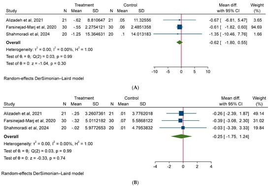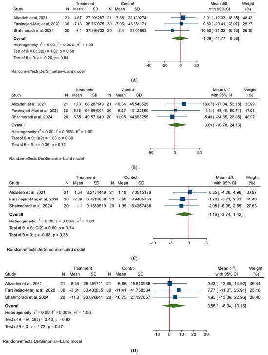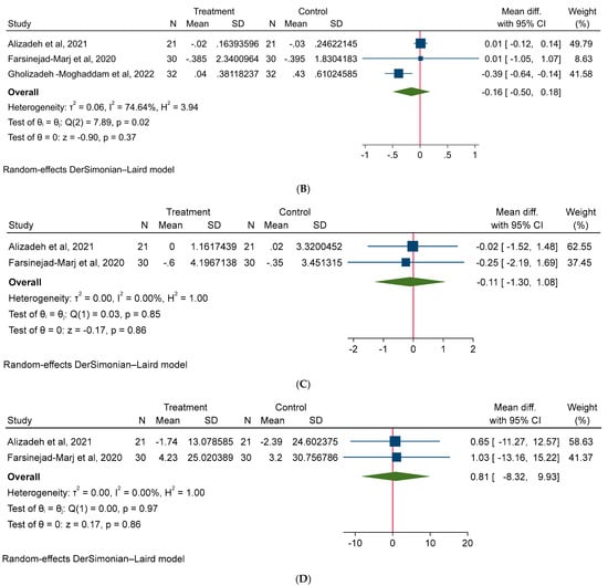 Our meta-analysis indicated that magnesium supplementation does not significantly affect DHEA (MD: −5.13 µg/dL; 95% CI: −43.26, 33.00, I2 = 80.20%), testosterone (MD: −0.16 ng/dL; 95% CI: −0.50, 0.18, I2 = 76.64%), FAI (MD: −0.11; 95% CI: −1.30, 1.08, I2 = 0.00%), and SHBG (MD: 0.81 nmol/L; 95% CI: −8.32, 9.93, I2 = 0.00%) levels in patients with PCOS (Figure 7).