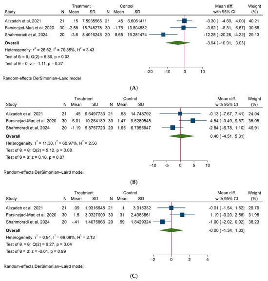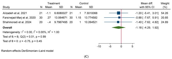 The effect of magnesium supplementation on anthropometric indices: (A) body weight, (B) body mass index, and (C) waist circumference in patients with PCOS.