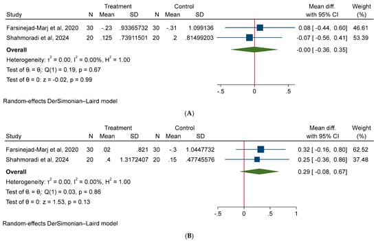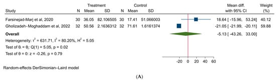 The meta-analysis employed STATA version 17.0 software (StataCorp, College Station, TX, USA), utilizing a random-effects model to analyze continuous outcomes, expressed as mean differences with 95% confidence intervals (CIs). Statistical significance was determined by p-values < 0.05. Heterogeneity among studies was evaluated via the I2 statistic > 50% []. Quantitative data underwent analysis for changes from baseline to follow-up, with missing standard deviations estimated based on available confidence intervals or other measures. Forest plots were utilized to present pooled effect sizes, with a significance threshold set at p < 0.05 for effect size estimation.