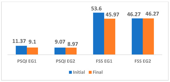 The results of FSS and PSQI scores from the two groups, EG1 and EG2.