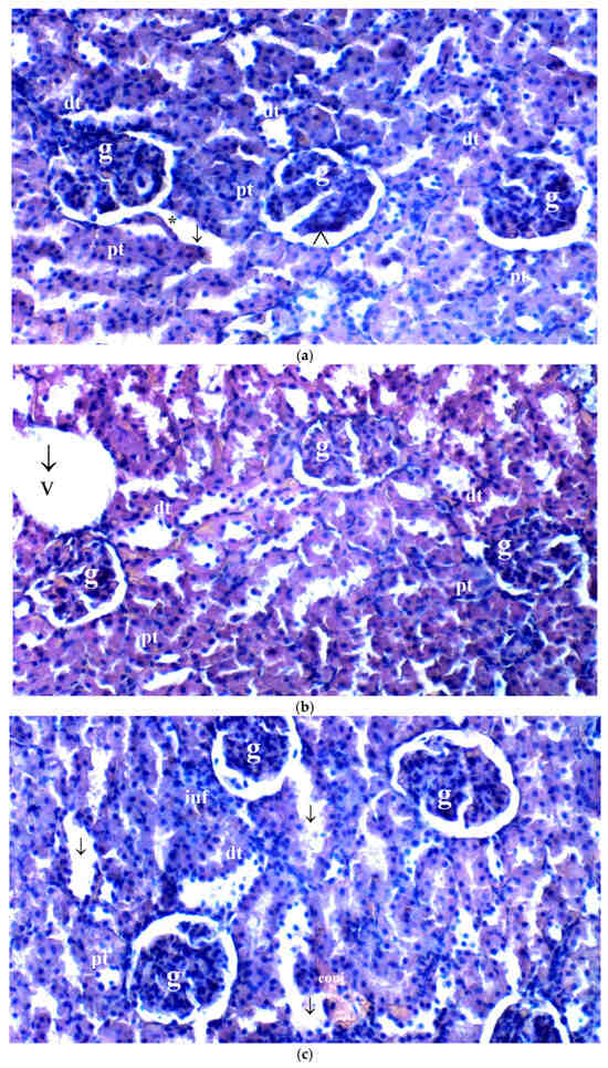 Renal injury was evaluated by assessing glomerular vacuolization (GV), tubular dilation (TD), vascular vacuolization and hypertrophy (VVH), tubular cell degeneration and necrosis (TCDN), Bowman space dilation (BSD), tubular hyaline cylinders (THC), lymphocyte infiltration (LI), and tubular cell shedding (TCS) [48]. Renal injuries were scored as follows: 0, no change; +1, minimal change; +2, medium; and +3, severe [49].
