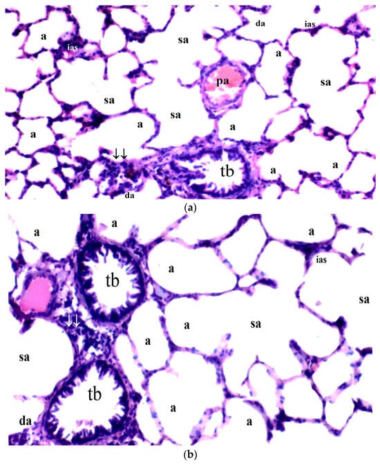 (a–d) Histopathological examination of lung tissues of C, B, IR and IR-BPC groups. (a): Normal lung tissue in group C, (b): lung tissue of group B, (c): lung tissue of group IR with increased leukocyte infiltration and thicker of the alveolar walls, (d): lung tissue of group IR-BPC with mild degeneration compared to group IR. Abbreviations: a—alveolus, sa—saccus alveolaris, da—ductus alveolaris, conj—congestion, tb—terminal bronchiole, ias—interalveolar septum, pa—pulmonary artery, ↓↓—parenchyma, rb—respiratory bronchiole, cong—capillary congestion.