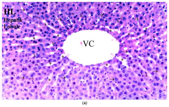 (a–d) Histopathological examination of liver tissues of C, B, IR and IR-BPC groups. (a): Normal liver tissue in group C, (b): liver tissue of group B, (c): liver tissue of group IR with increased necrotic cells and hepatocyte degeneration, (d): liver tissue of group IR-BPC with mild degeneration compared to group IR. Abbreviations: ep—epithelium, vc—vena centralis, hl—hepatic lobule, →—hepatocytes, k—Kupffer cells, *—sinusoids, (*)—sinusoid dilatation, cong—capillary congestion, ↓—parenchyma.