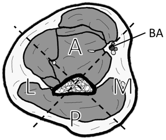 Classification of soft tissue defect locations around the elbow. The elbow is divided into four zones by drawing a line connecting the center of the humerus and the brachial artery (BA), and a perpendicular line to it: A (anterior), M (medial), P (posterior), and L (lateral).